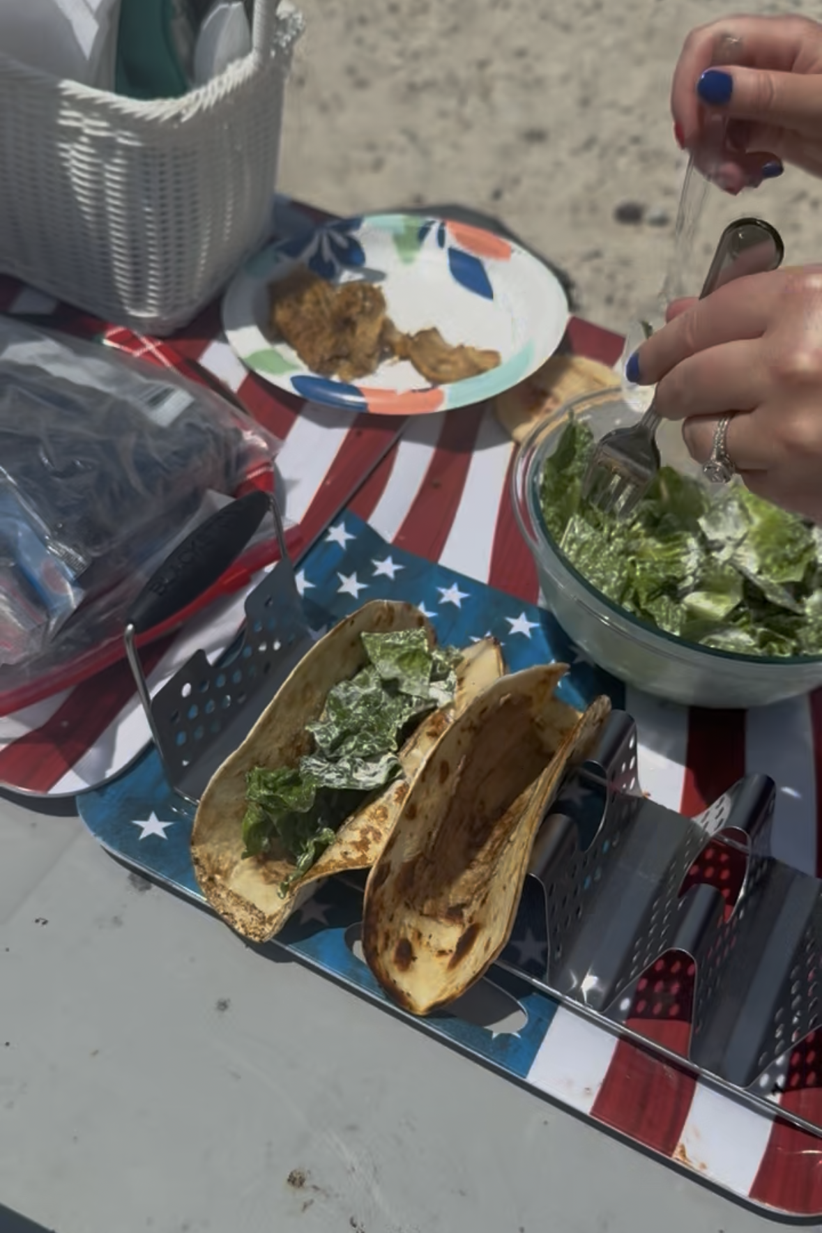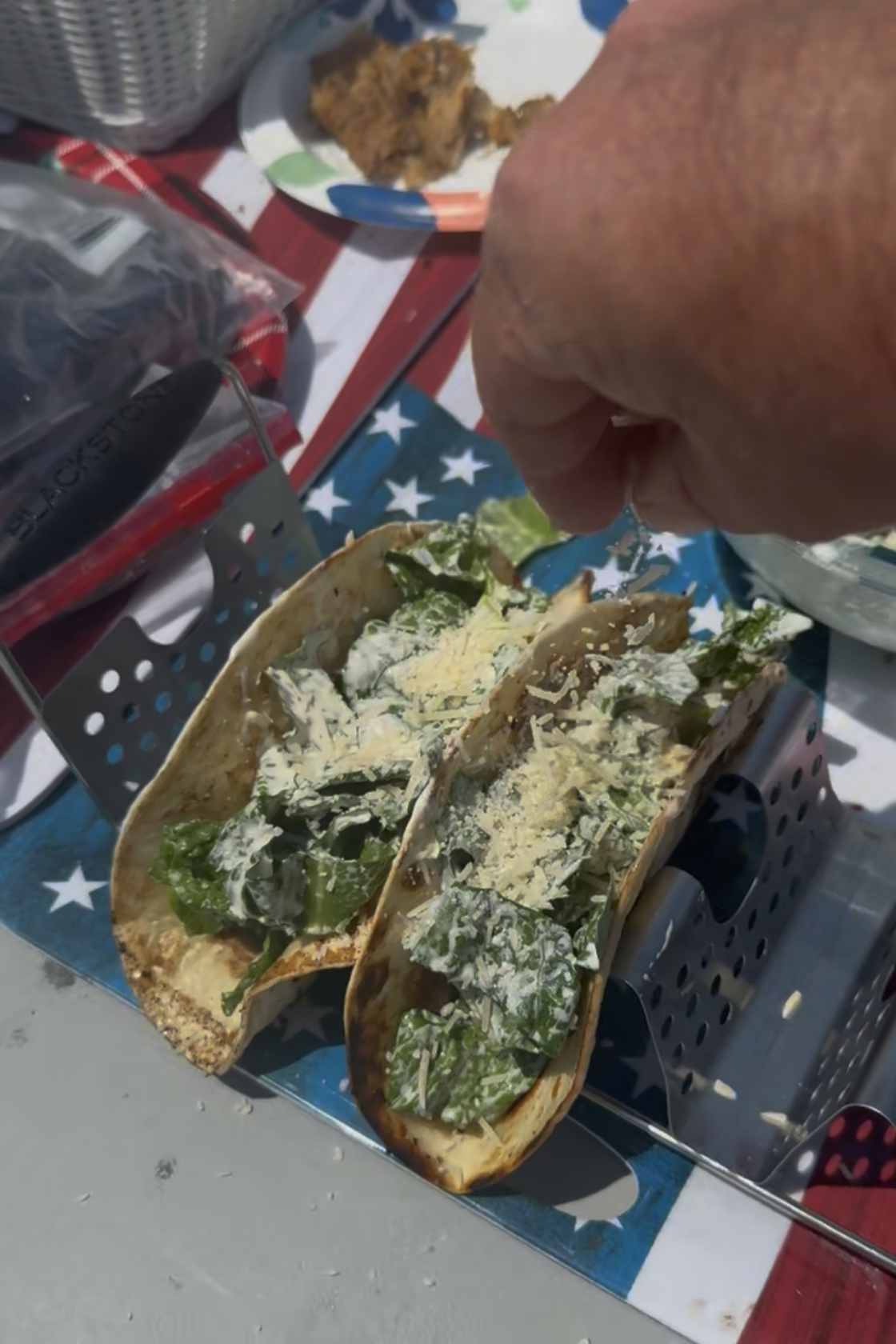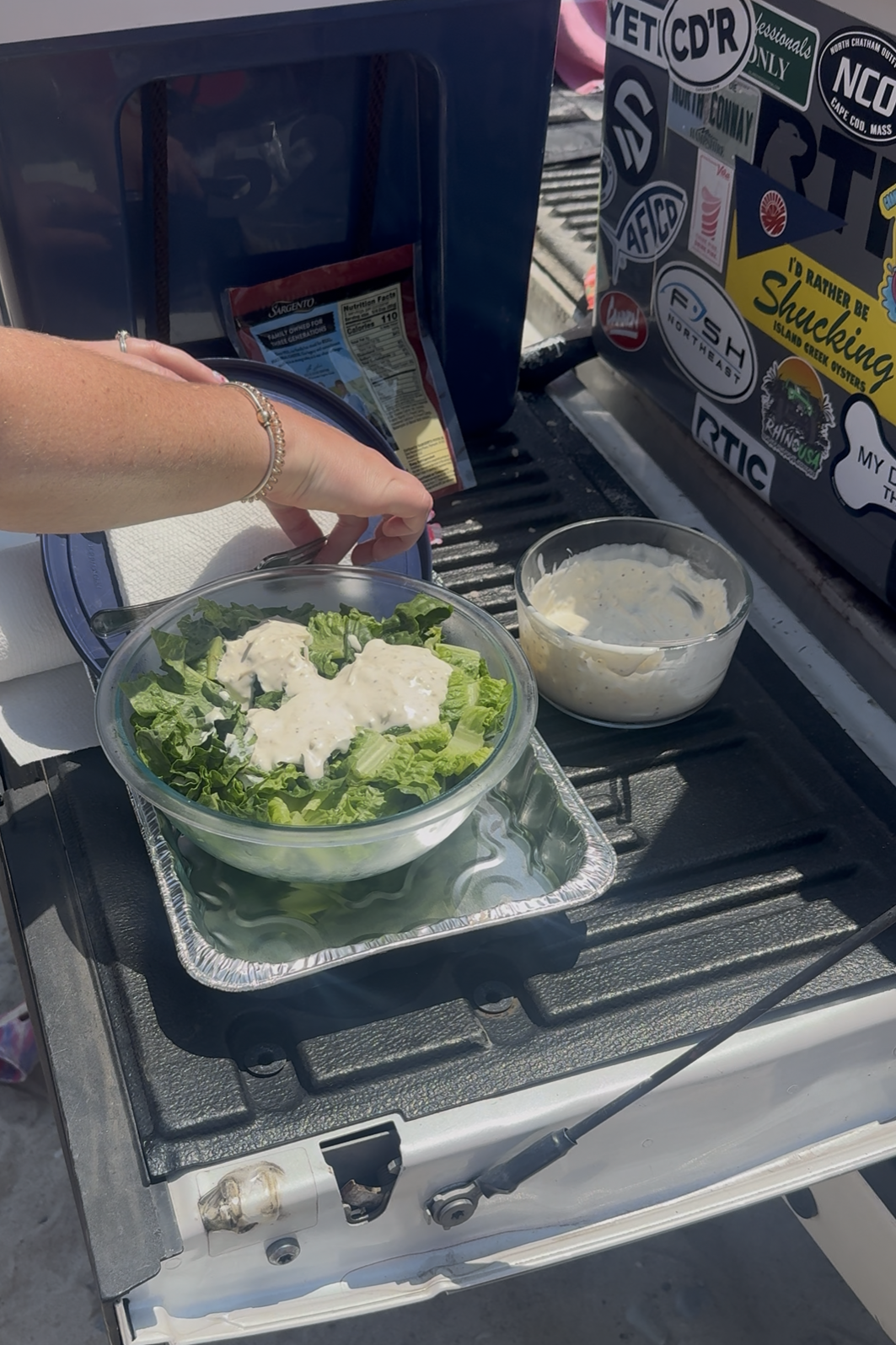 Prepare Caesar salad (Romaine, Dressing, Croutons)